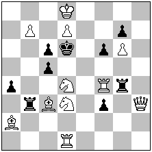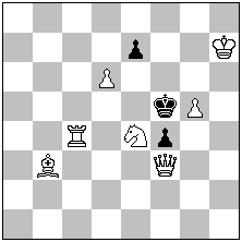 10 נקודות. ציון הנושאים 5 נקודות. אף אחד מהפותרים לא הצליח להגיע לעמדה זו. חלק מהפותרים שמו צריח שחור ב-ד1 כך שההגנה 1...פד3 חוסמת את הקו ומאפשרת את המט. קבלתי את זה כפתרון ראוי. אולם מיקום המלך הלבן ב-ד1 מאפשר את המפתח שנותן מפלט מאחר והרץ על ד5 כפות! זה מאפשר גם להגיע לעמדה חסכונית מאד וגם שני מסעי התיקון מתירים את הרץ. הורדתי ניקוד במקרים בהם היו בעמדה יותר מ 13 כלים (זה המספר האופטימאלי עם צריח שחור ד1) ובמקרים בהם היו דואלים. |