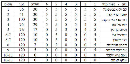 תוצאות: מקום 1-2 - לב גליאצנשפיגל מקום 1-2 - יואל אלוני מקום 3 - ישראל צור מקום 4 - דמיטרי בייביקוב